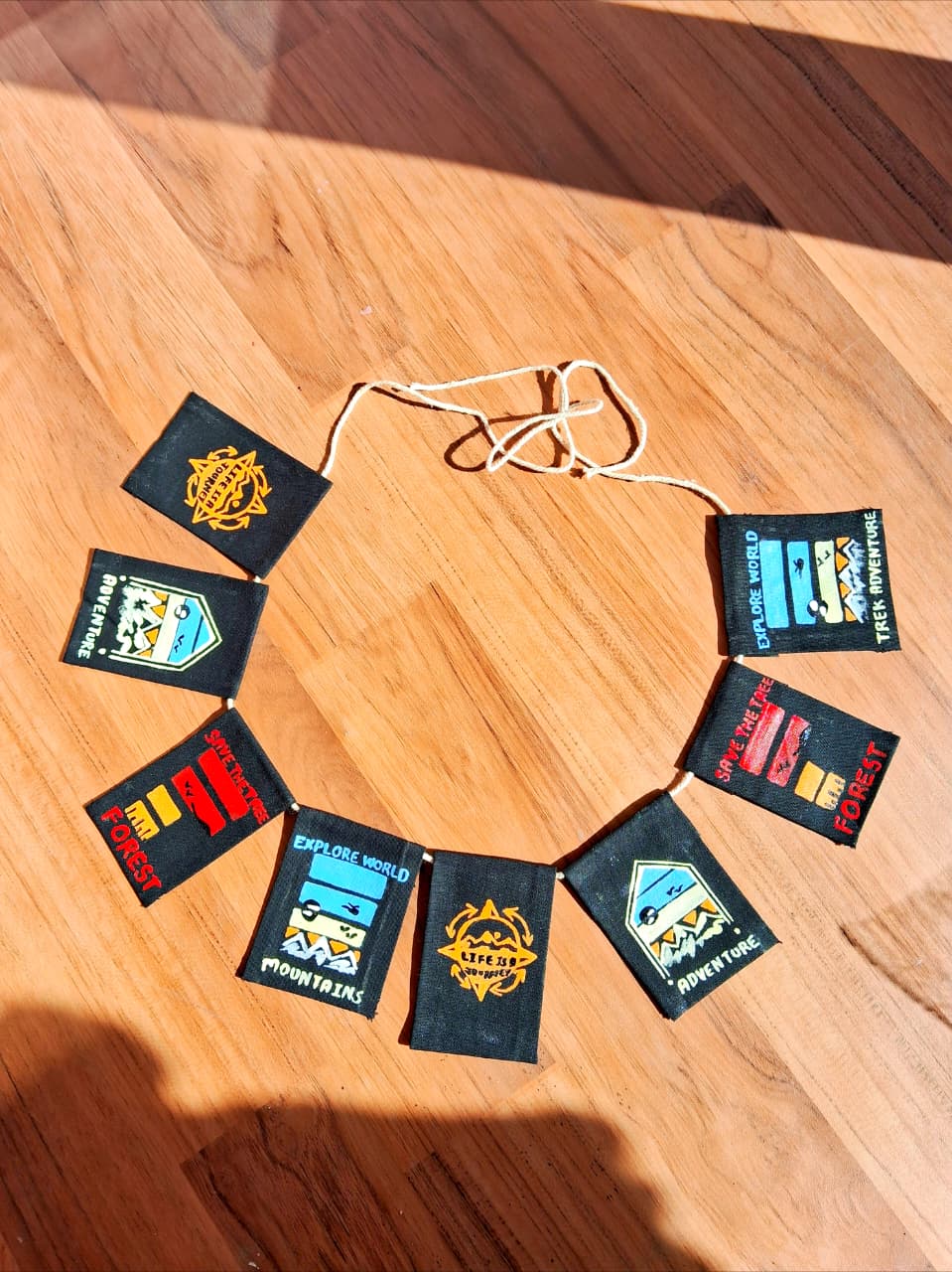 Crafted on rich black cotton fabric, this Himalayan Toran features vibrant acrylic handpainted patterns inspired by the colours and spirit of the mountains. Each piece is handmade in the Himalayas, giving it an authentic and soulful charm.
